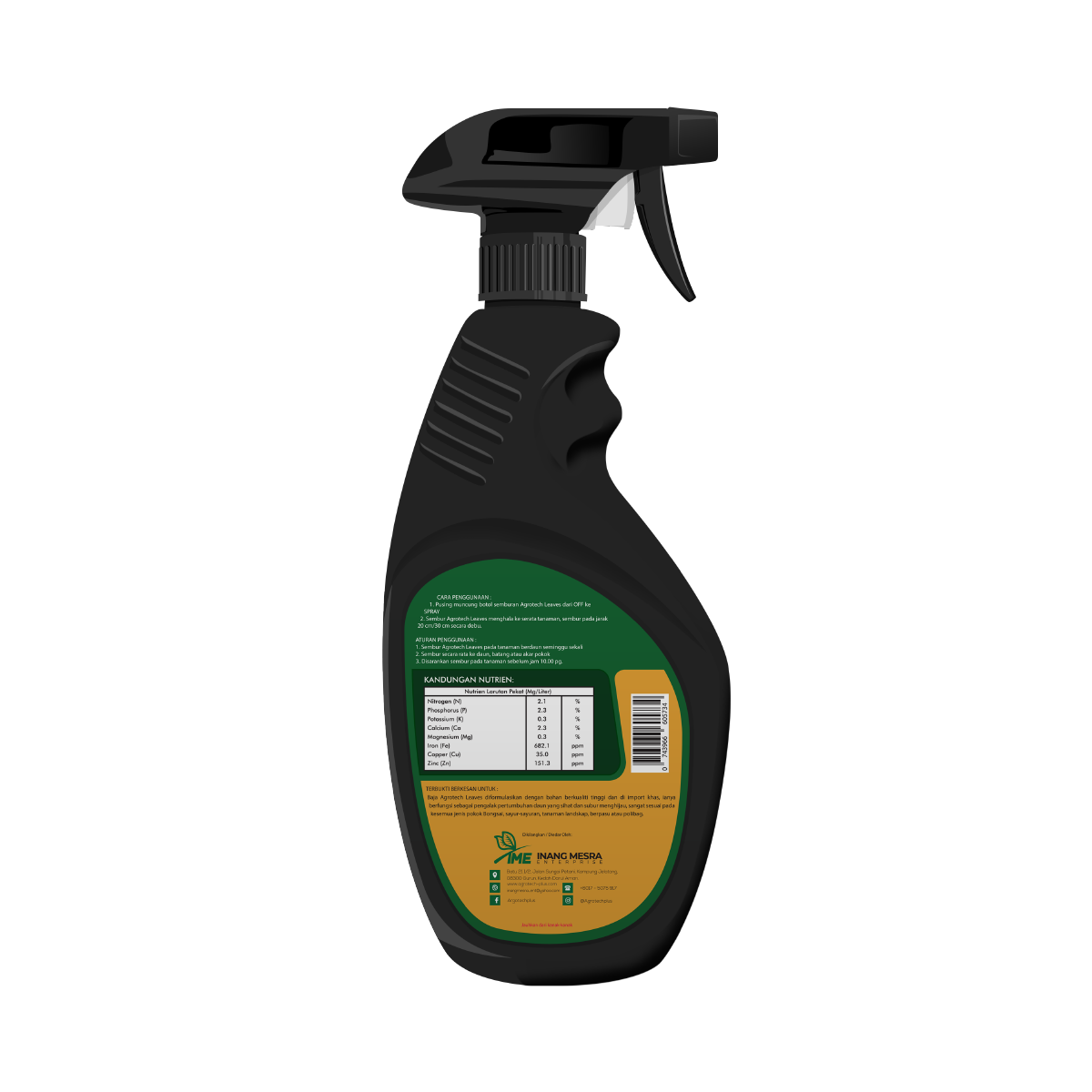 - Agrotech Leaves di formulasi dengan mengunakan bahan mikro dan makro kimia serta bahan semulajadi seperti Pati Lidah Buaya (Aloe Vera) & Rumpai Laut (Spirulina) dengan kadar vitamin yang tinggi nutrisi untuk menjadikan pokok berdaun anda lebih hijau dan sihat bersinar